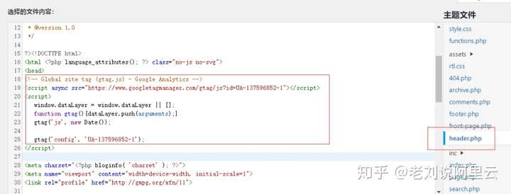 找到header.php文件,然后把在google analytics复制的代码,黏贴在<head>的下方就可以了,然后更新下文件。